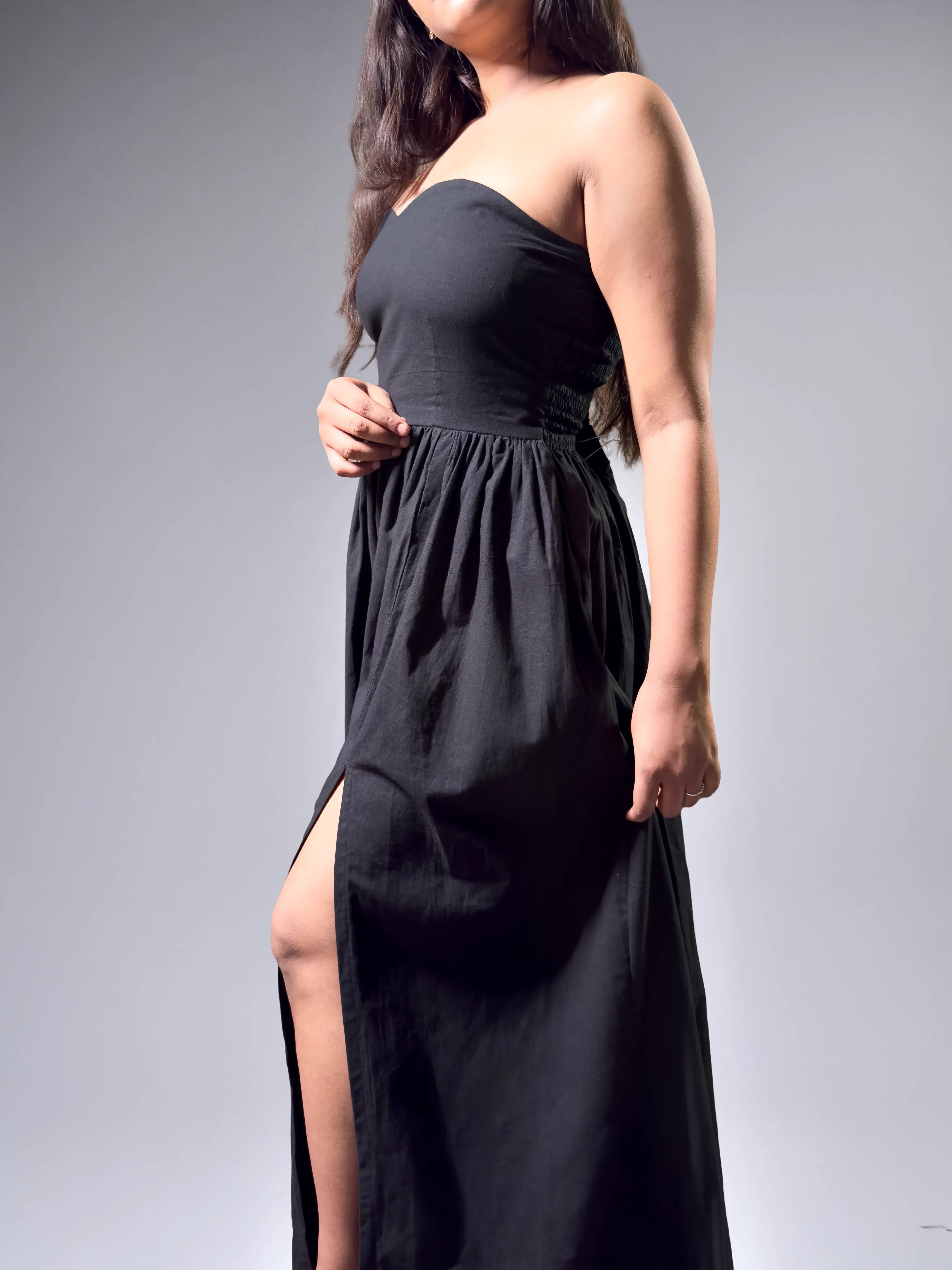Turn heads and steal hearts in this striking strapless peach maxi dress, adorned with a lush bloom of multicolored florals. With a sweetheart neckline and a structured bust, this dress flows into voluminous pleats that celebrate movement and freedom. A celebration of springtime joy, this piece is perfect for brunches, garden parties, or even an intimate evening soirée. Designed for the woman who lives boldly and dresses beautifully.