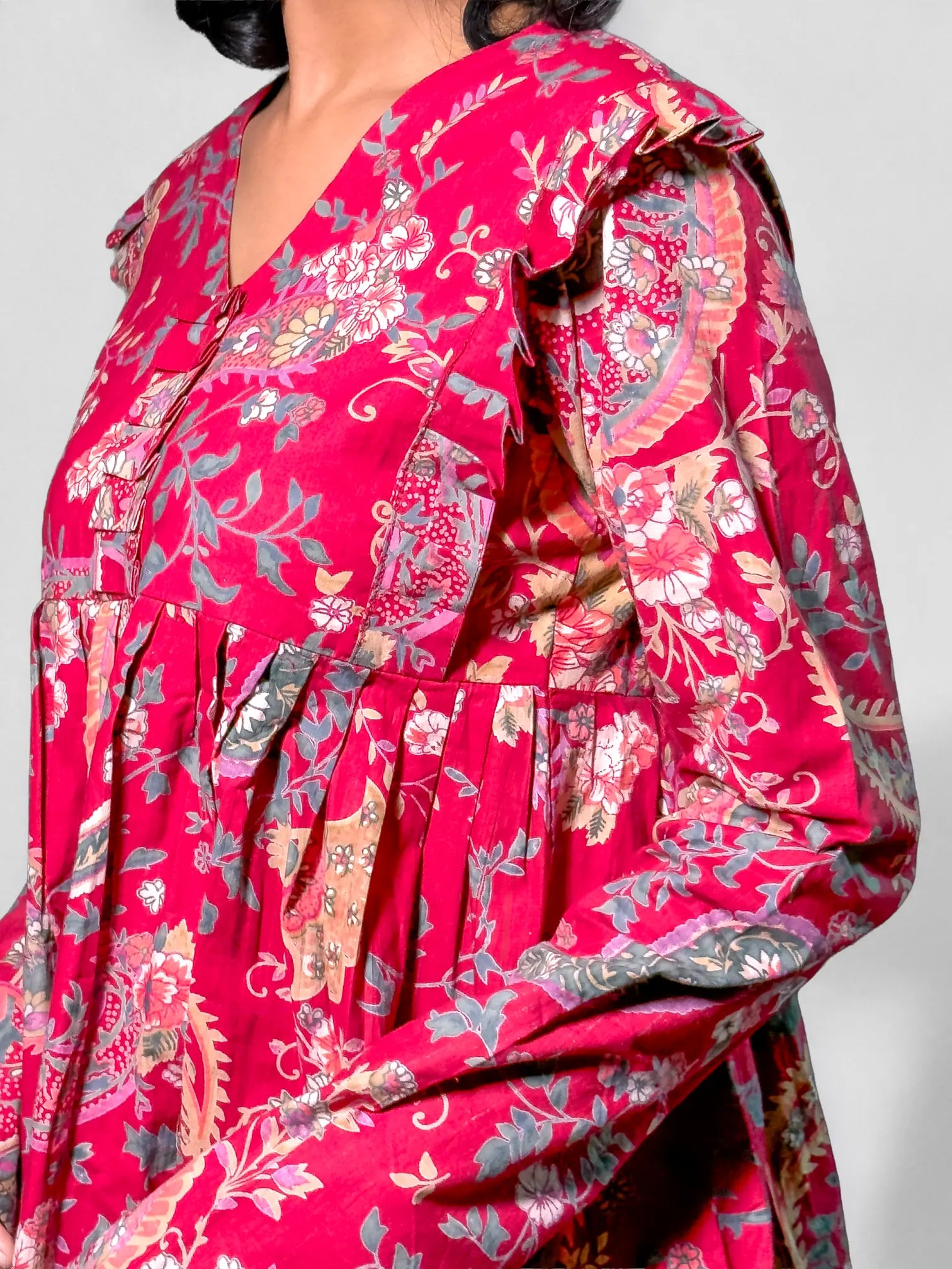 - Flowing pleated flare for graceful movement