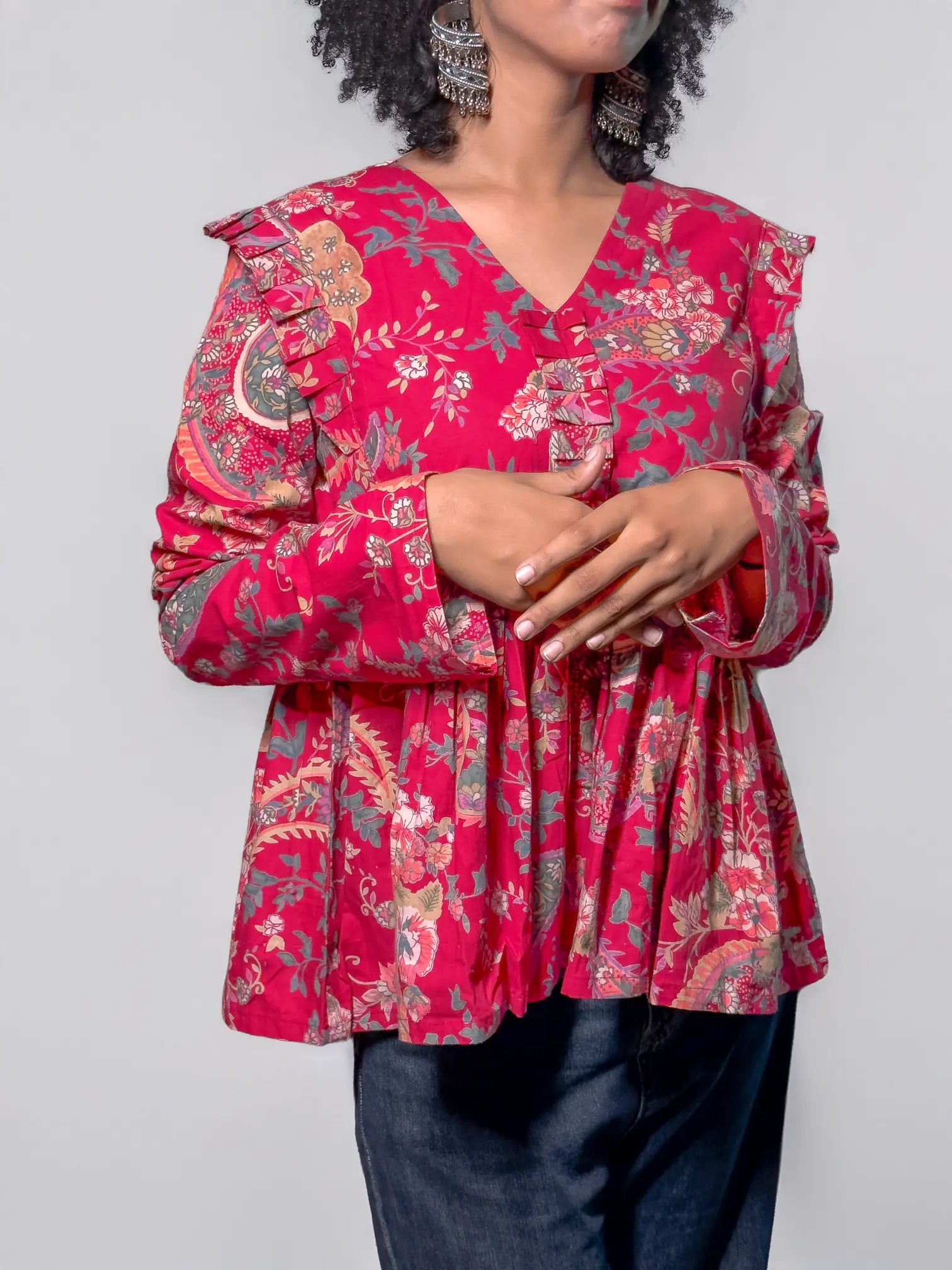 - Bold multicolored floral print on soft peach base