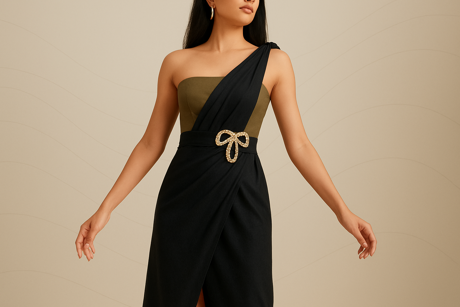 Black & Olive One-Shoulder Slit Gown